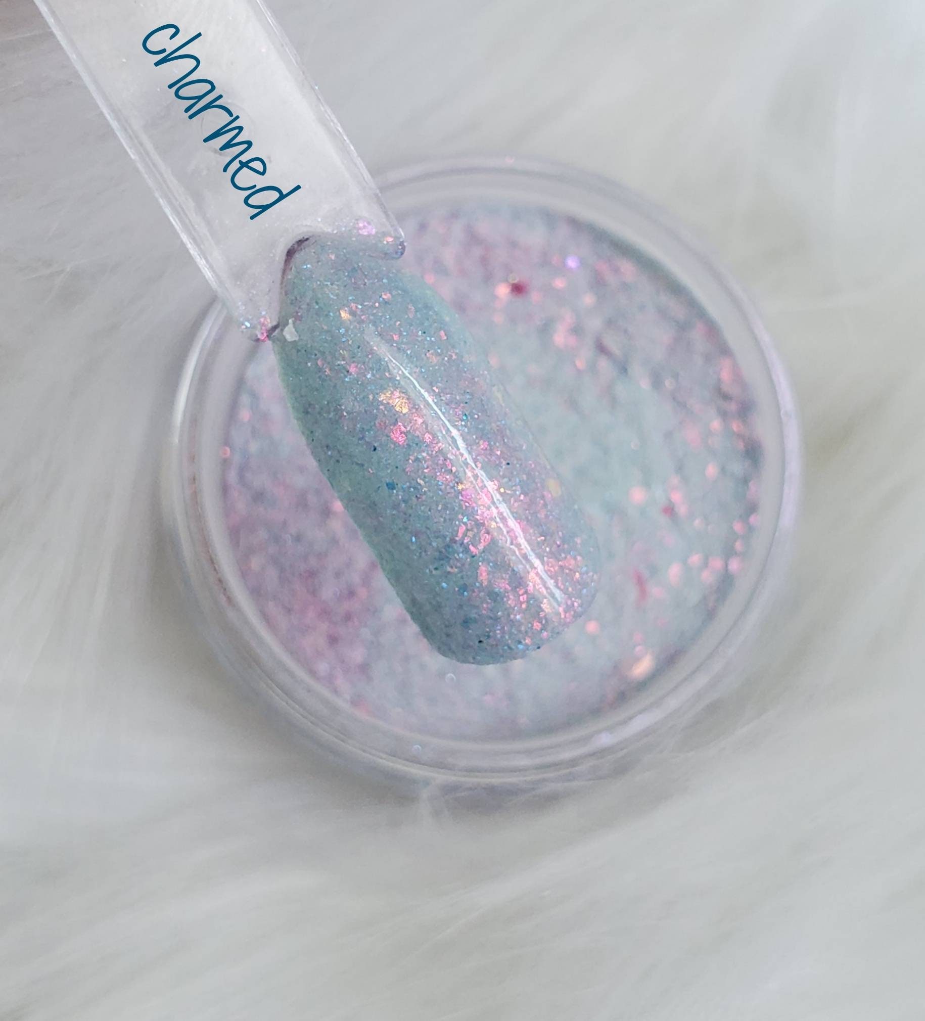 color: light blue base with pink flakies