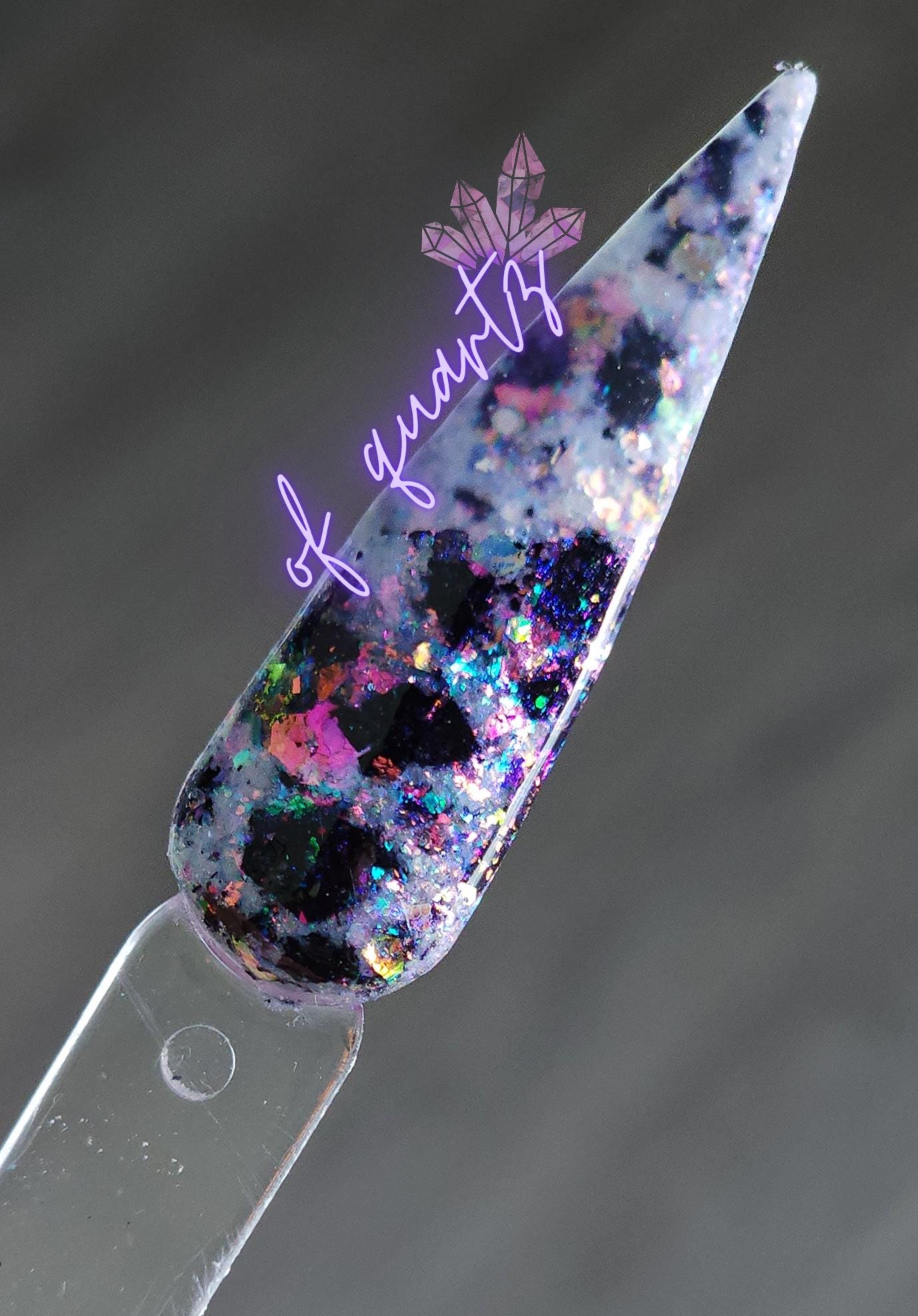 Color : milky white base with shimmer, opal flakies, and black foils.