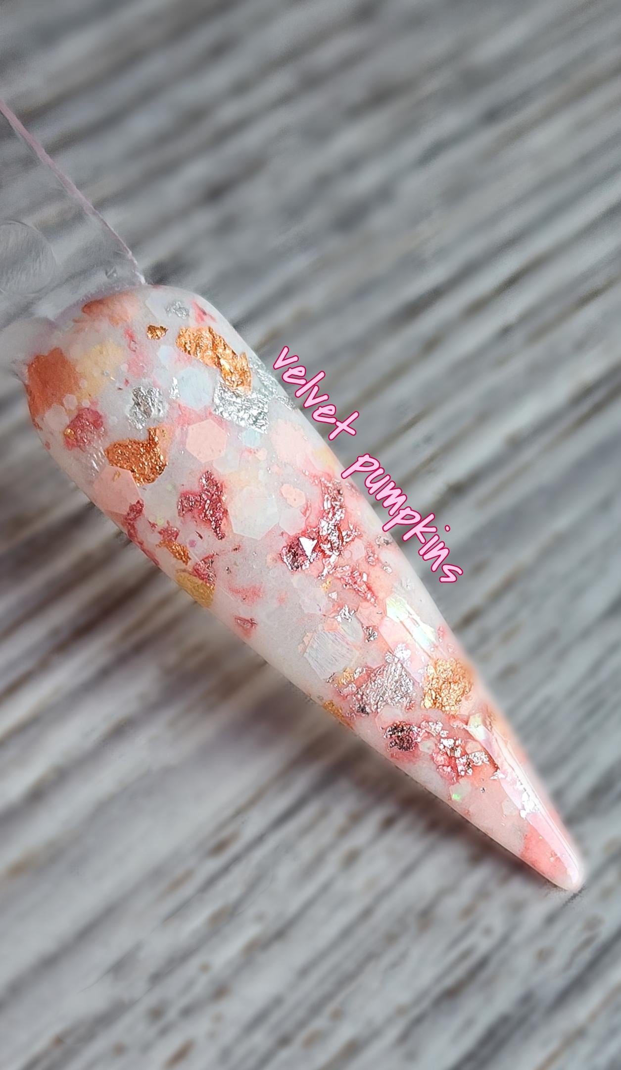 color : Milky sheer white base with rose gold, rose pink, and gold flakes mixed with opal and baby pink glitters.