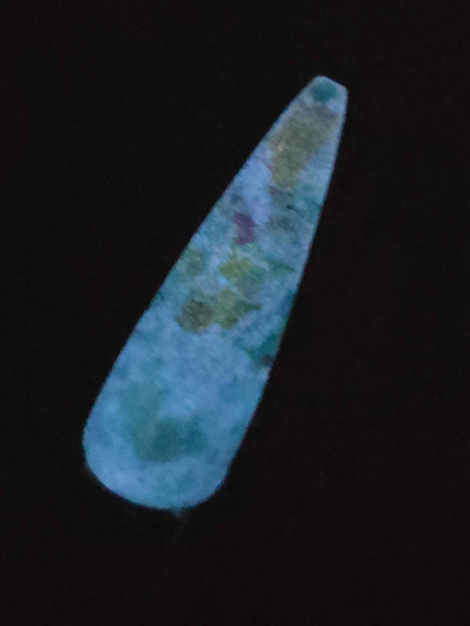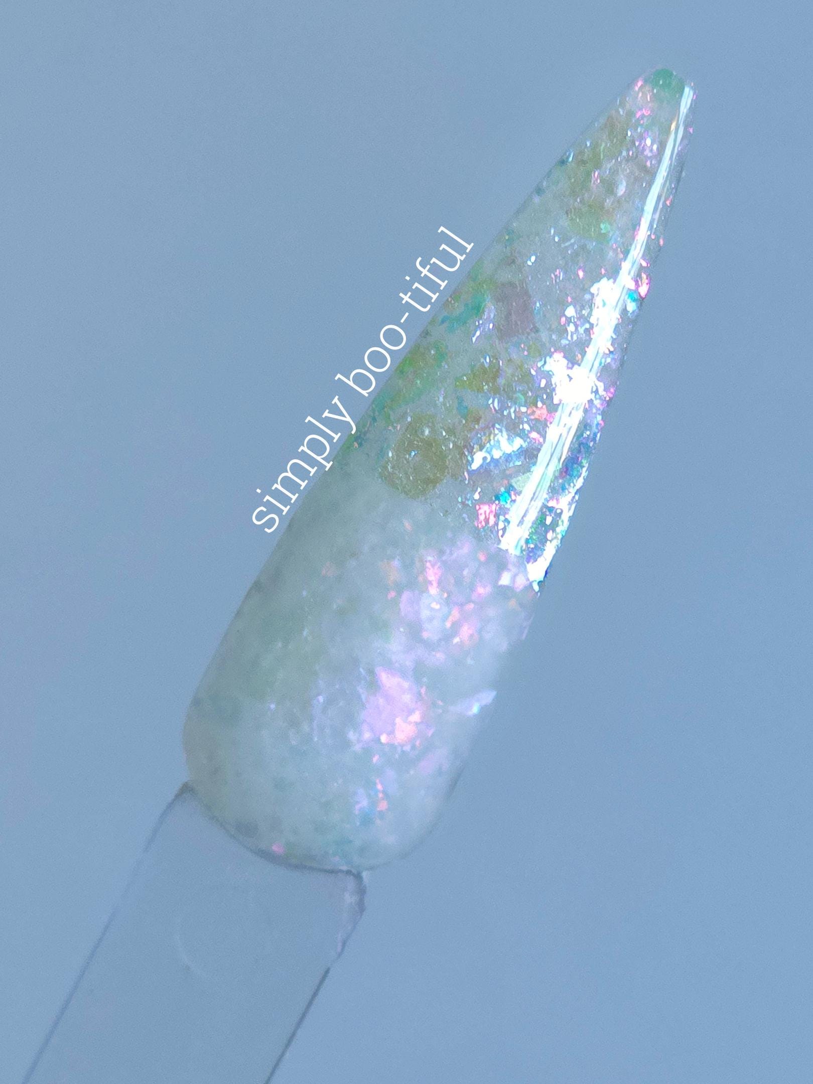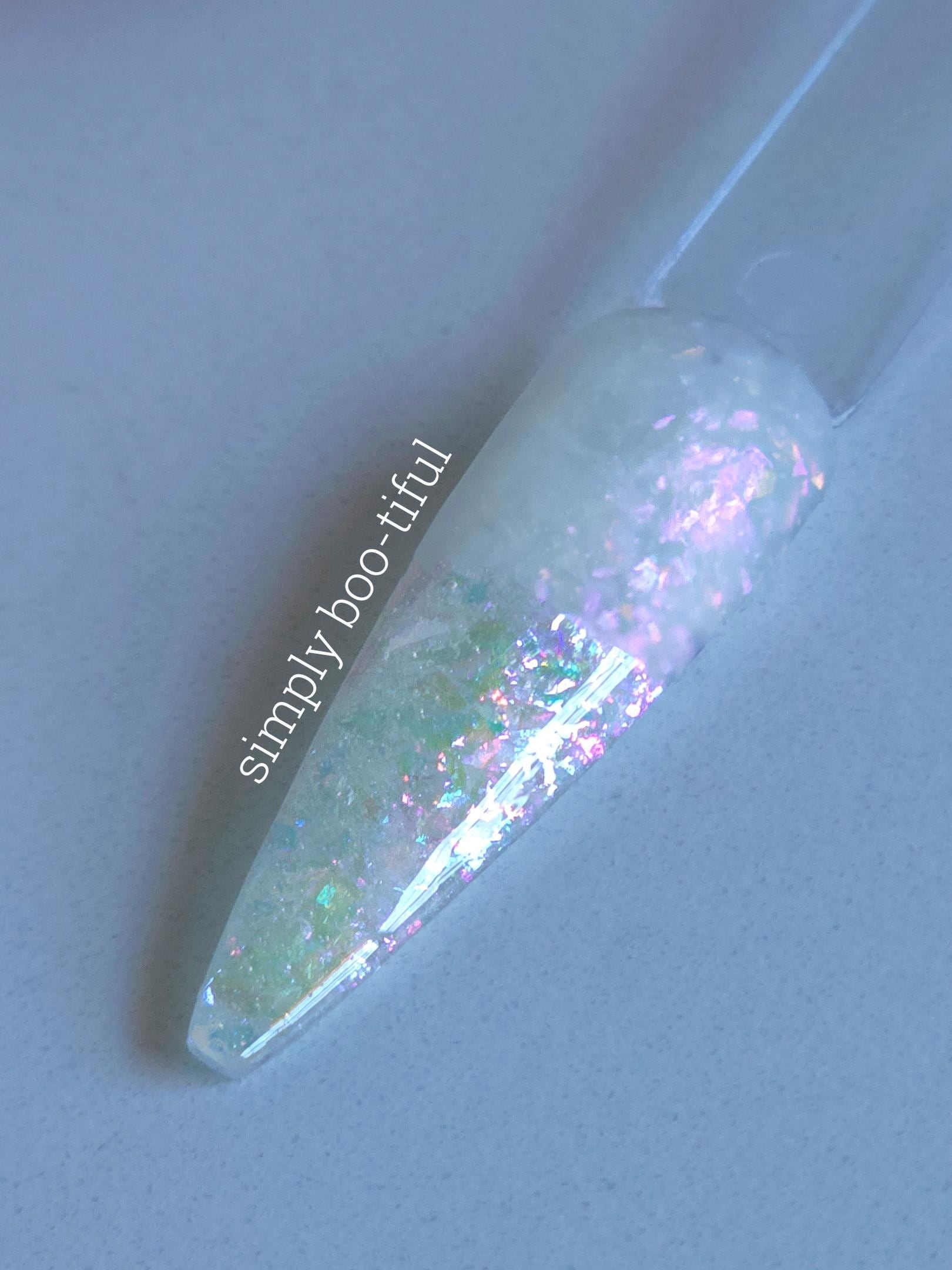 color : semi sheer white base with opal flakies. glows white in the dark.