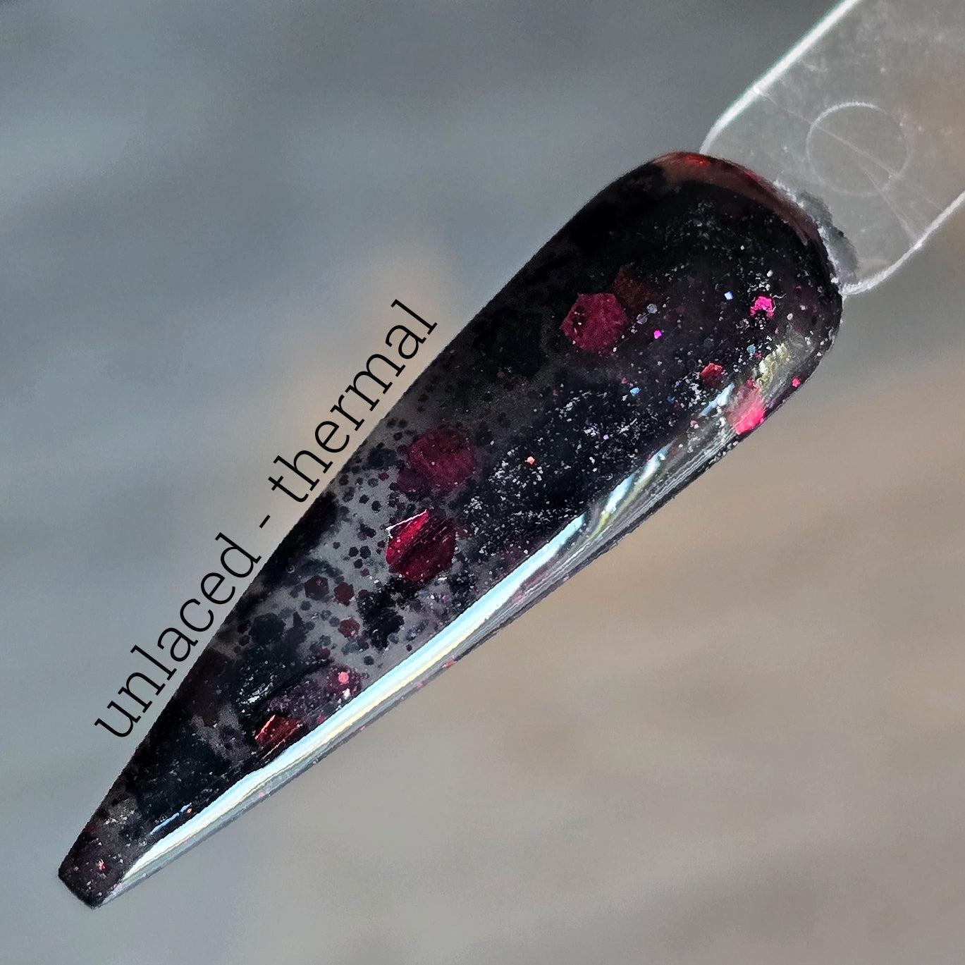 color: ( my personal FAV! 😍 ) - thermal - colorless (warm) to black (cold) with plum/black/wine glitters and black foils