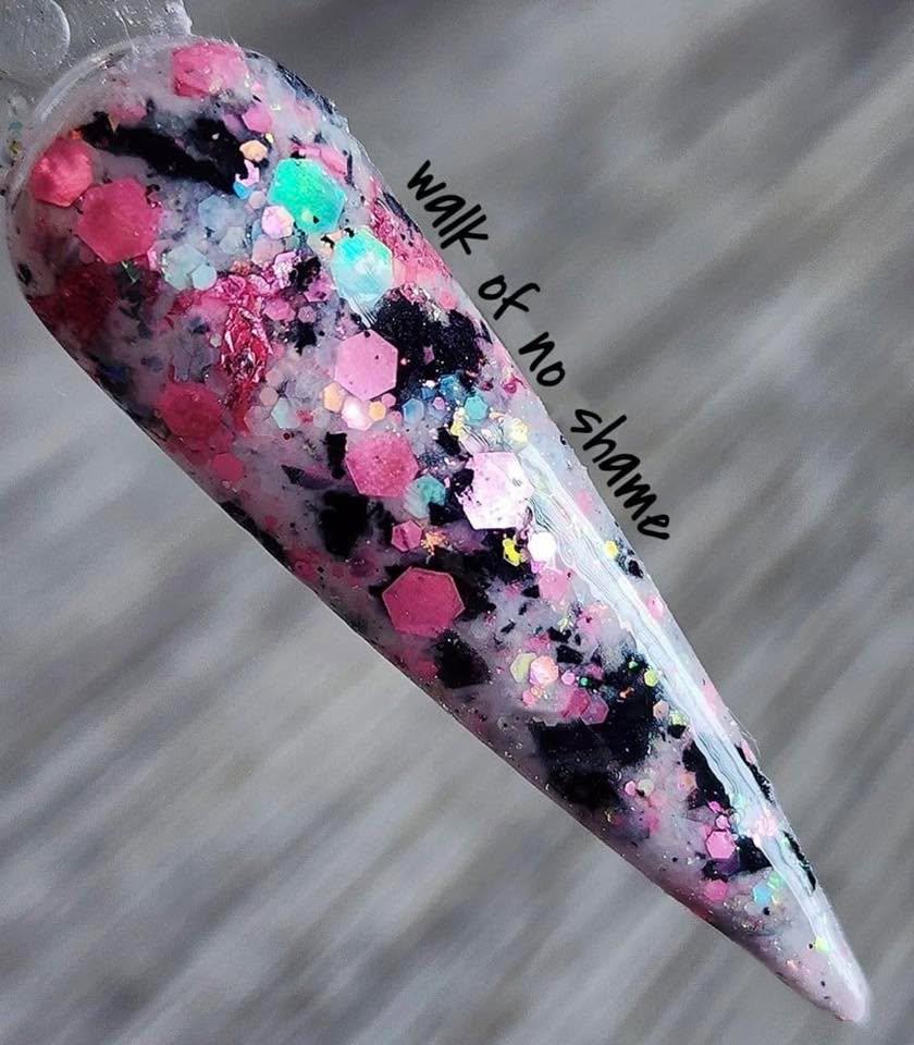 color : milky white base with opal/pink chunky glitters, opal flakies, and pink and black foils