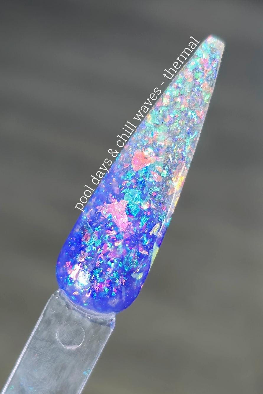 color : thermal - violet blue (cold) to sheer (warm) with lots of opal flakies.