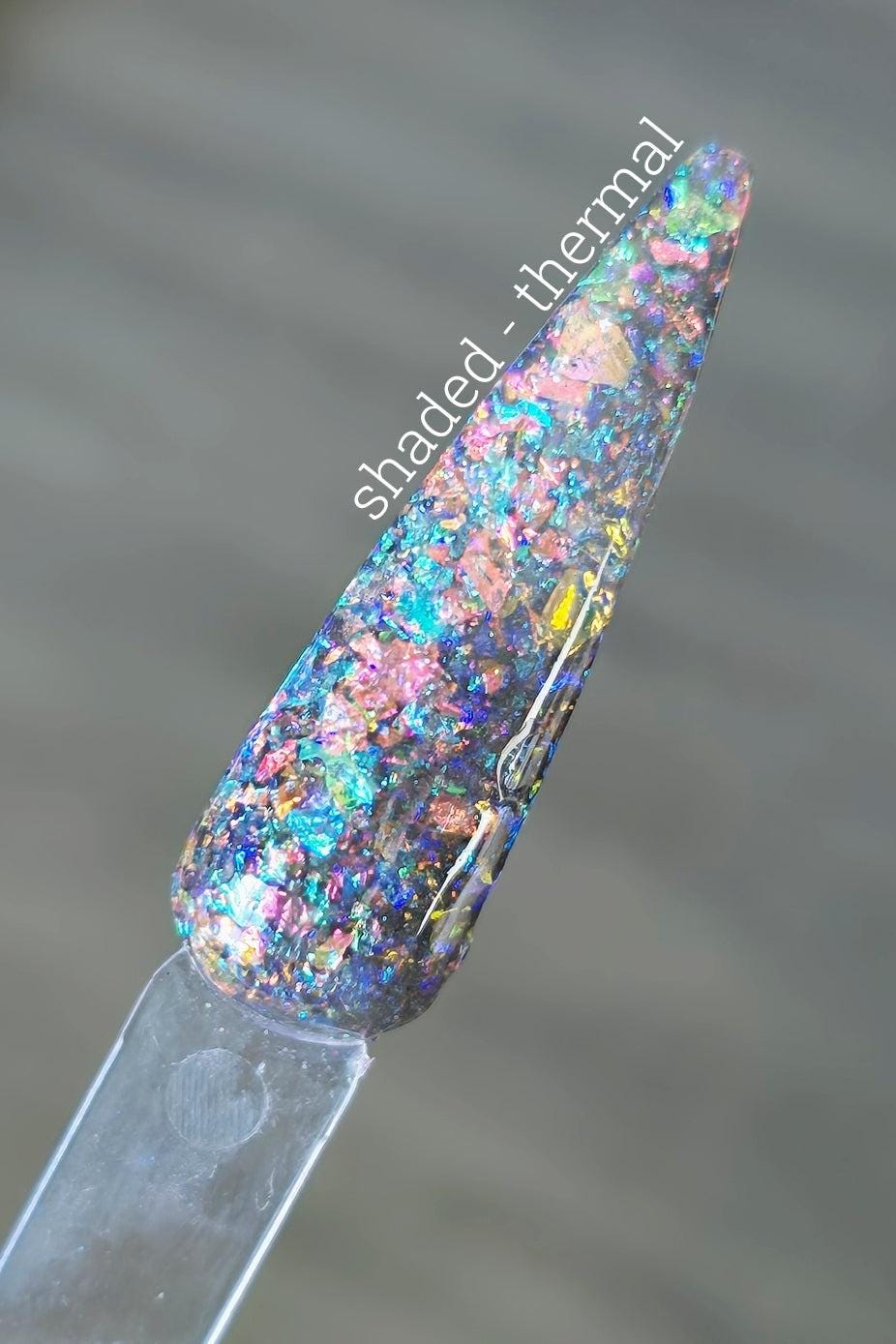 color : thermal - dark grey (cold) to sheer (warm) with tons of opal flakies.