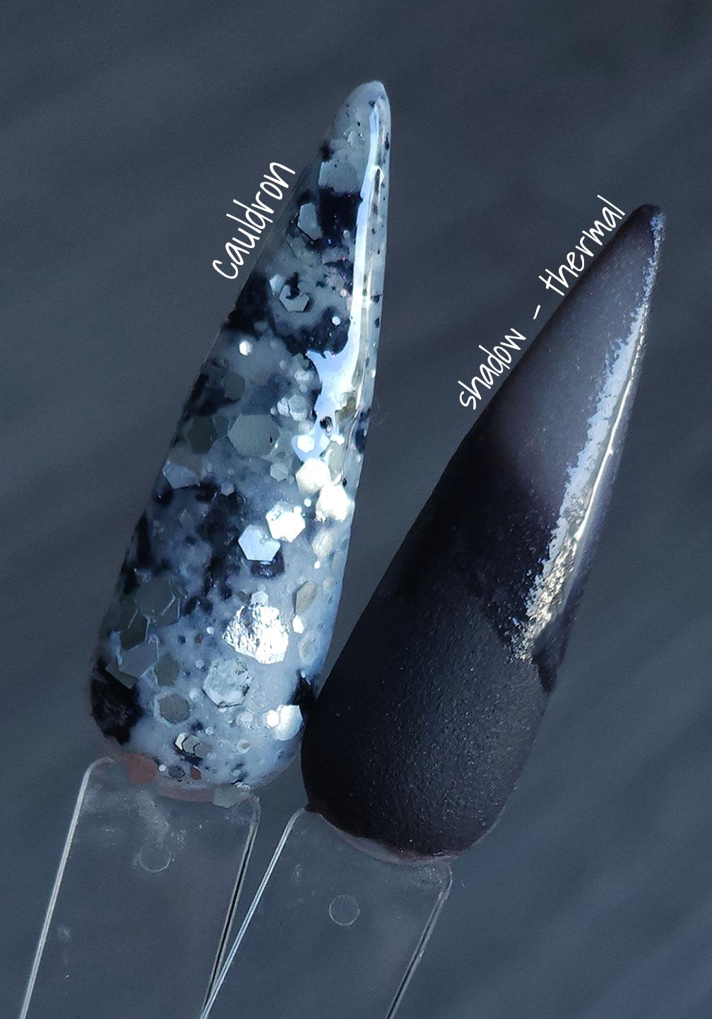 cauldron - milky white base with matte grey glitter & black/silver foils.