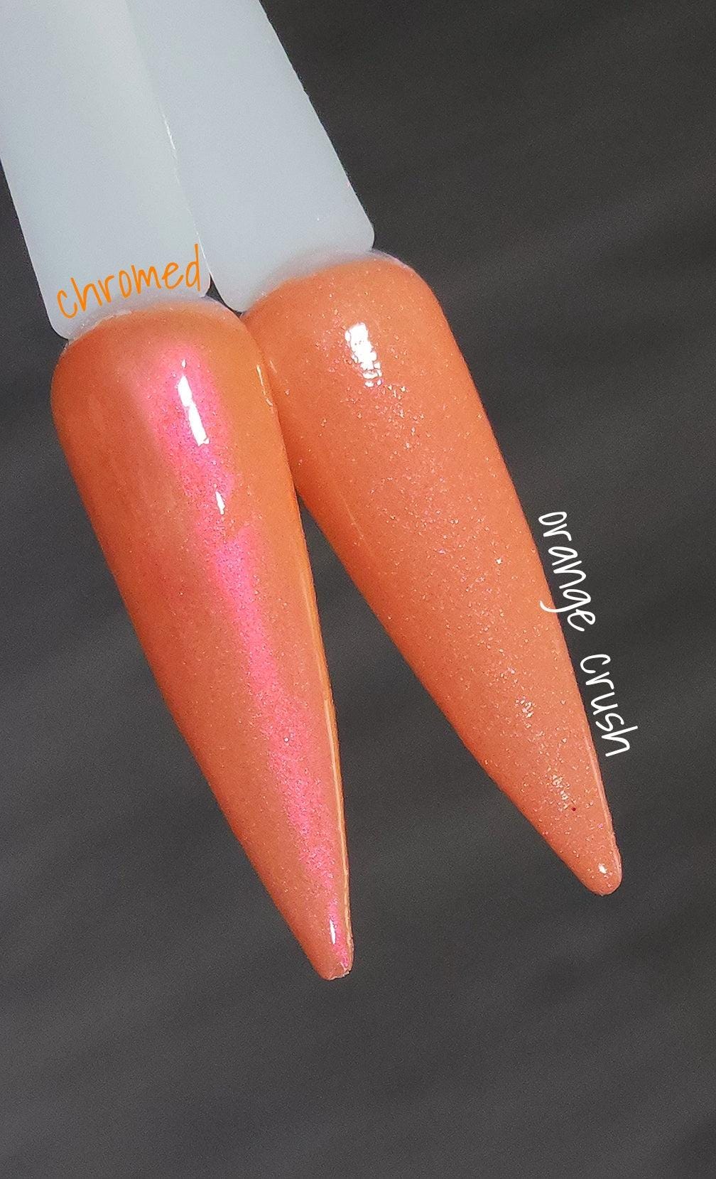 color: shimmery orange with chameleon pigment that shimmers a pinkish-red tone.