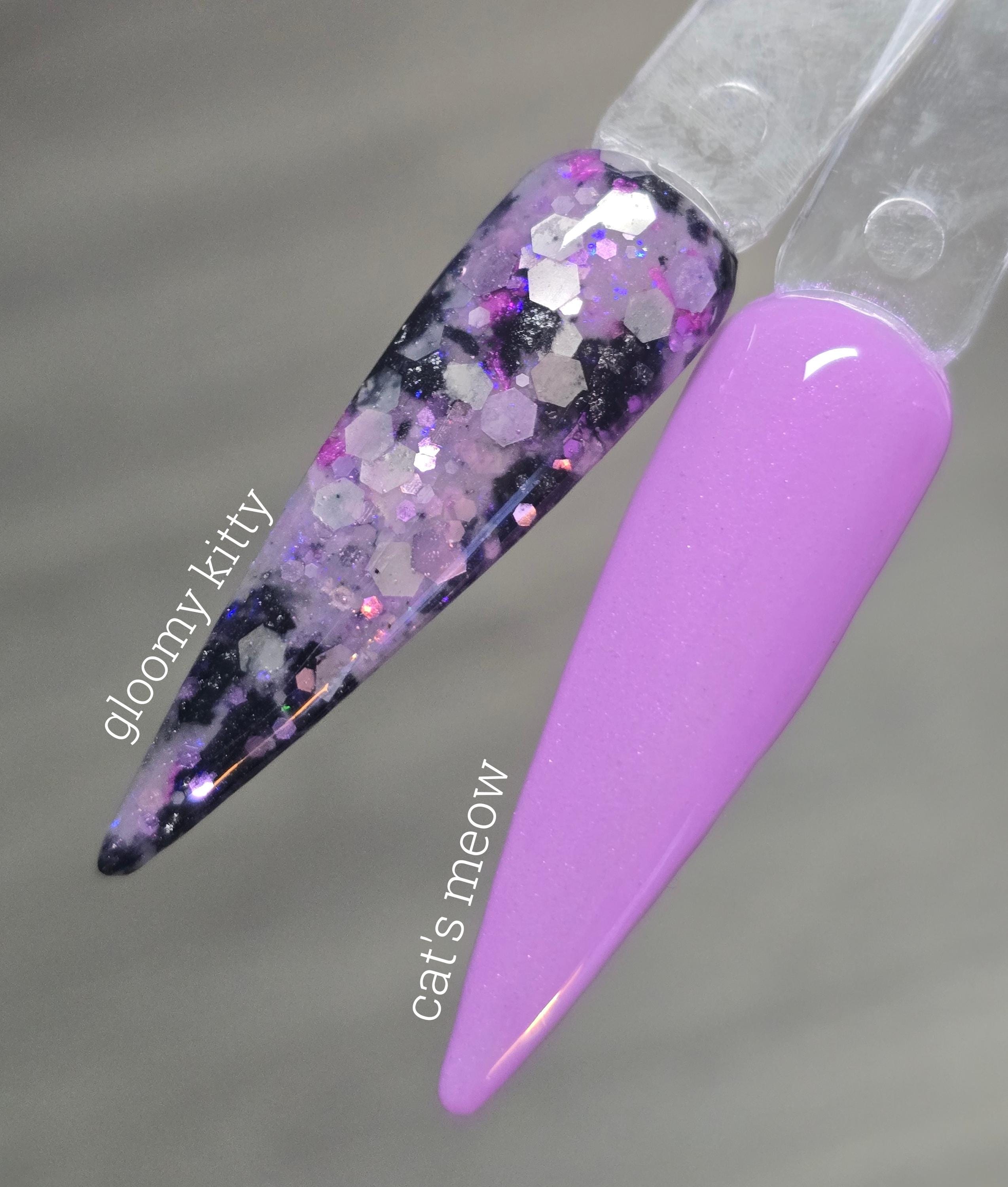 color : gloomy kitty - sheer base with purple and white metallic and matte glitters and purple/black foils.
